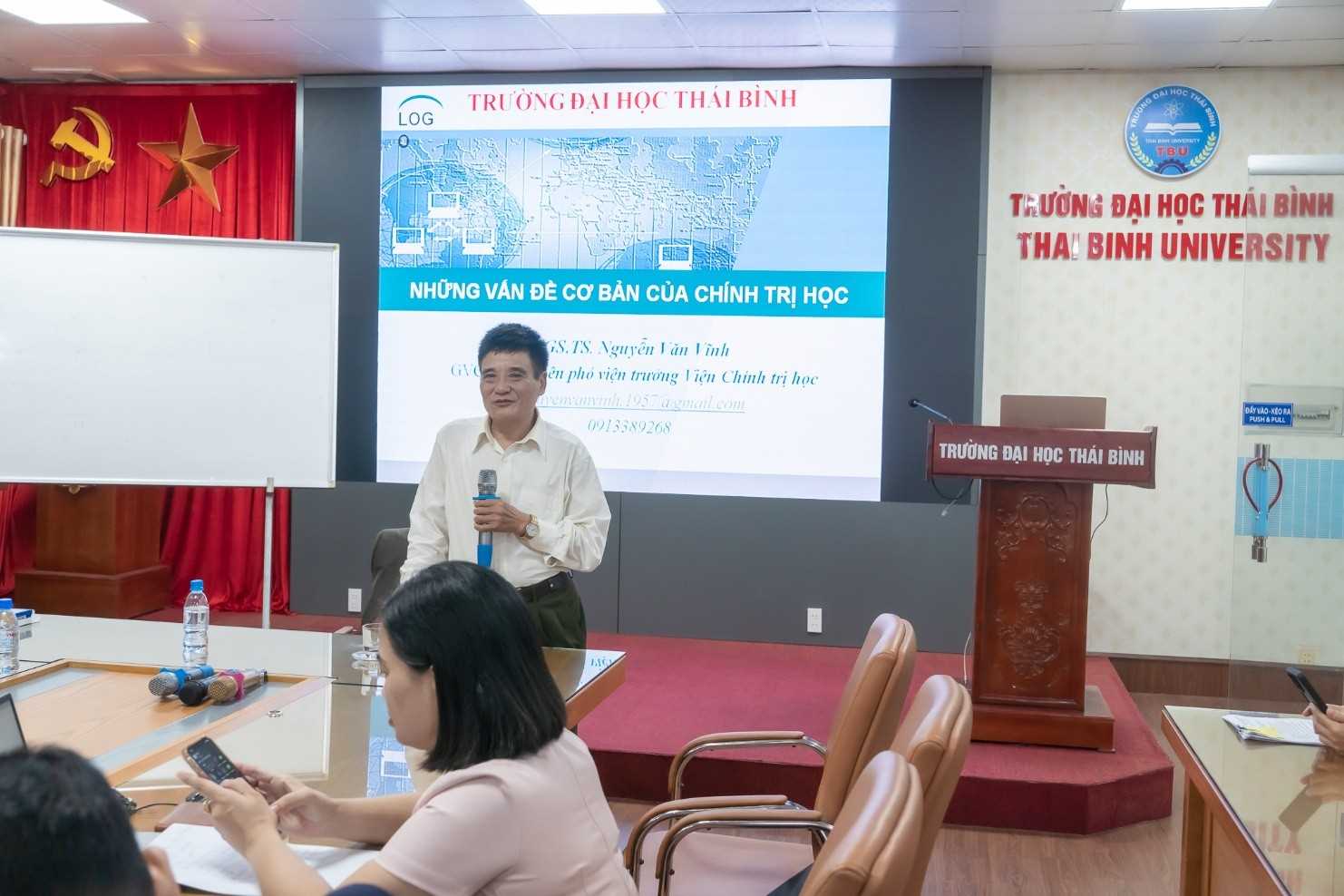Trong khuôn khổ “Khóa đào tạo, bồi dưỡng và cập nhật kiến thức về Luật, Chính trị học và Quan hệ quốc tế” dành cho cán bộ, giảng viên và cán bộ cấp xã của tỉnh, Trường Đại học Thái Bình đã mời PGS.TS. Nguyễn Văn Vĩnh – Giảng viên cao cấp, nguyên Phó Viện trưởng Viện Chính trị học, Học viện Chính trị Quốc gia Hồ Chí Minh, nhà khoa học có nhiều năm kinh nghiệm nghiên cứu và giảng dạy trong lĩnh vực chính trị học về giảng chuyên đề “Những vấn đề cơ bản của Chính trị học” và “Phương pháp nghiên cứu Chính trị học”.