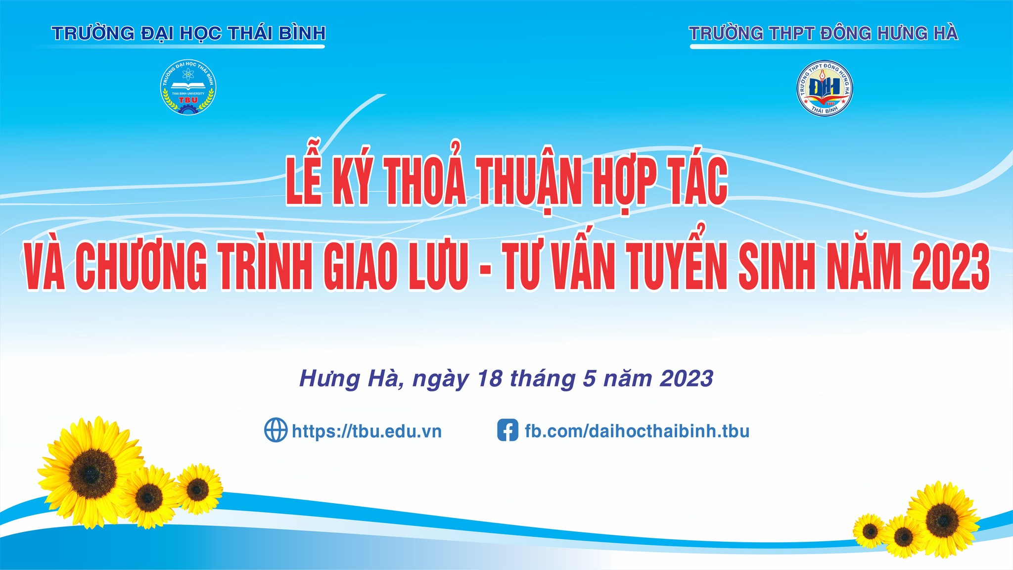 Sáng ngày 18/5/2023, tại trường THPT Đông Hưng Hà, huyện Hưng Hà, tỉnh Thái Bình, diễn ra Chương trình Giao lưu – Tư vấn tuyển sinh năm 2023 và Ký kết thoả thuận hợp tác giữa trường Đại học Thái Bình và trường THPT Đông Hưng Hà nhằm giới thiệu truyền thống xây dựng và phát triển của trường Đại học Thái Bình, tổ chức giao lưu, tư vấn, hướng nghiệp chọn ngành nghề cho học sinh trường THPT Đông Hưng Hà và ký kết biên bản hợp tác giữa hai Nhà trường.